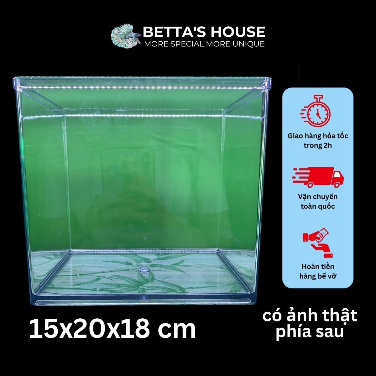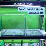 Với kích thước 15x12x15 cm (dài x rộng x cao), bể cá mini này có thể chứa một số loại cá nhỏ và các loại sinh vật nước nhỏ khác. Bạn có thể trang trí bể cá với những cây cảnh, đá và các phụ kiện trang trí để tạo nên một môi trường sống tự nhiên và hấp dẫn cho cá và sinh vật trong bể.