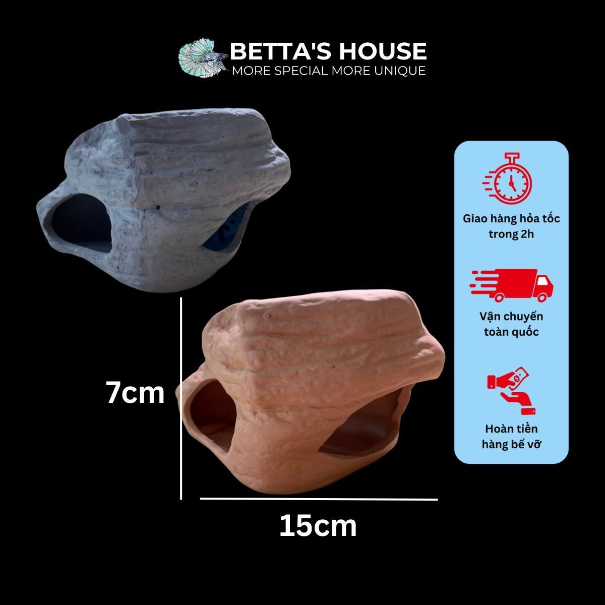 Đến với Betta's House ngay hôm nay để chọn lựa cho mình những hang trú ẩn tuyệt vời nhất, giúp tạo nên một ngôi nhà hoàn hảo cho những chú cá yêu quý của bạn!