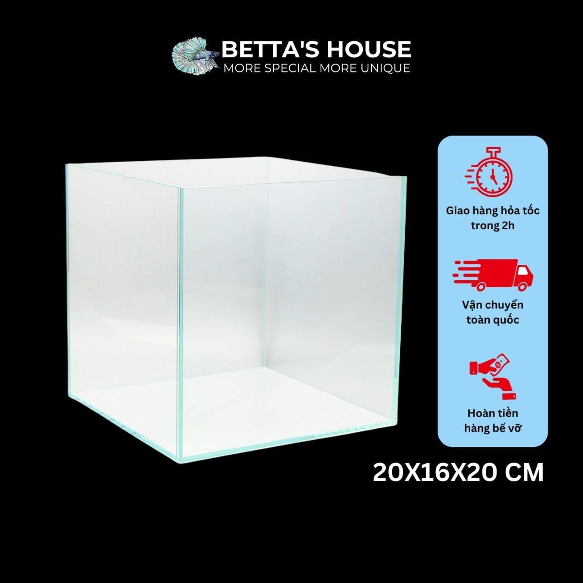 Hồ Cá 20x16x20 cm - Betta's HouseHồ cá 20x16x20 cm của Betta's House là sự lựa chọn lý tưởng cho người yêu thích nuôi cá cảnh nhỏ và cây thủy sinh. Thiết kế tinh tế với chất liệu kính dày 4mm trong suốt, tạo ra không gian tự nhiên và...
